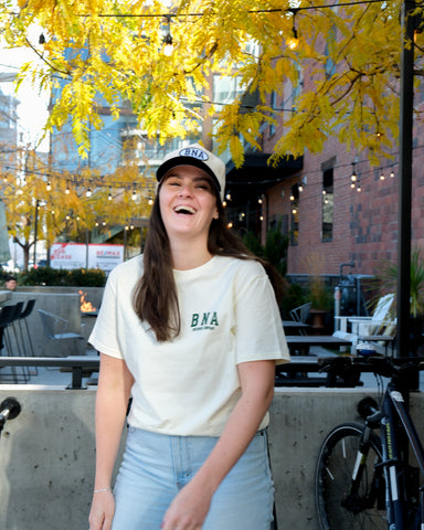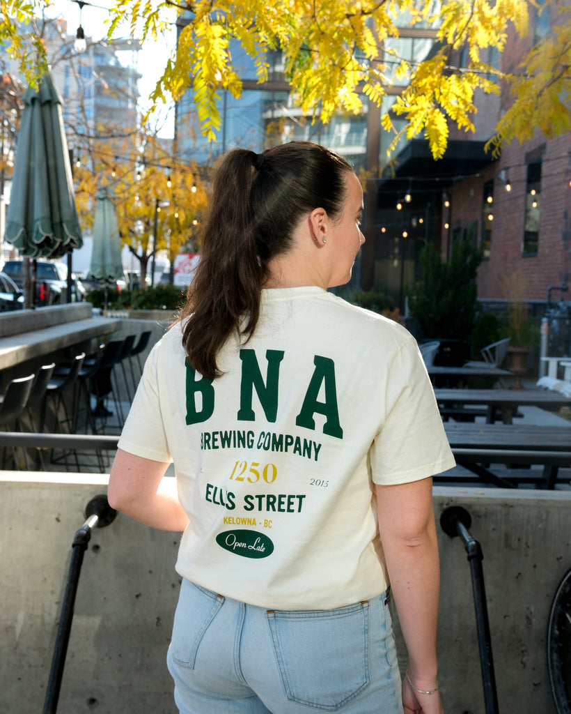 A piece of us to take with you. Small BNA Brewing Co. logo on the chest, large BNA Kelowna address on the back.